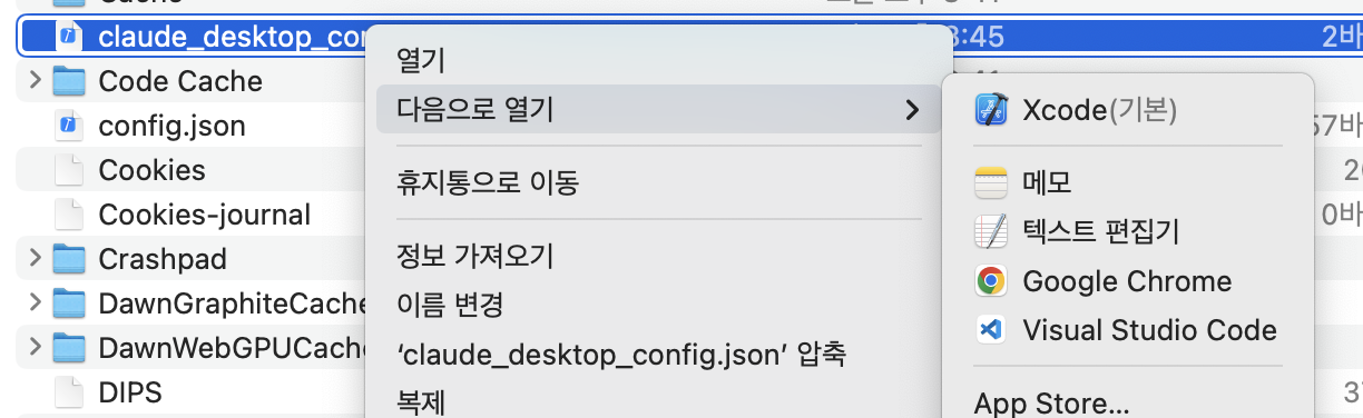 이제 여기서 claude_desktop_config.json 을 우클릭후 텍스트 편집기에 들어간다.