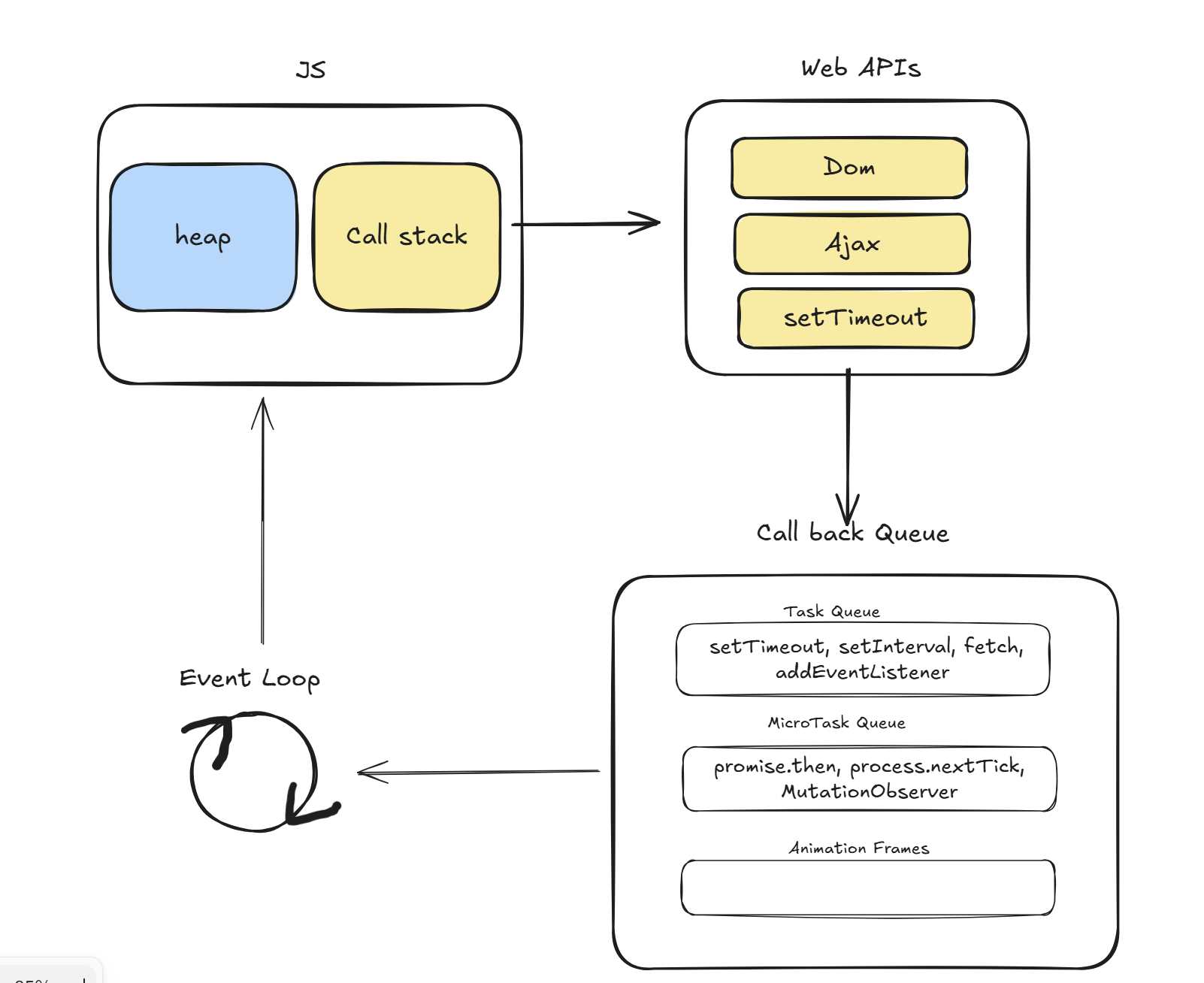 . 자바스크립트 엔진은 '요청'만 보내고, 실제로 시간이 오래 걸리는 작업(네트워크, 타이머 등)은 브라우저가 제공하는 Web APIs 영역에서 수행된다.
