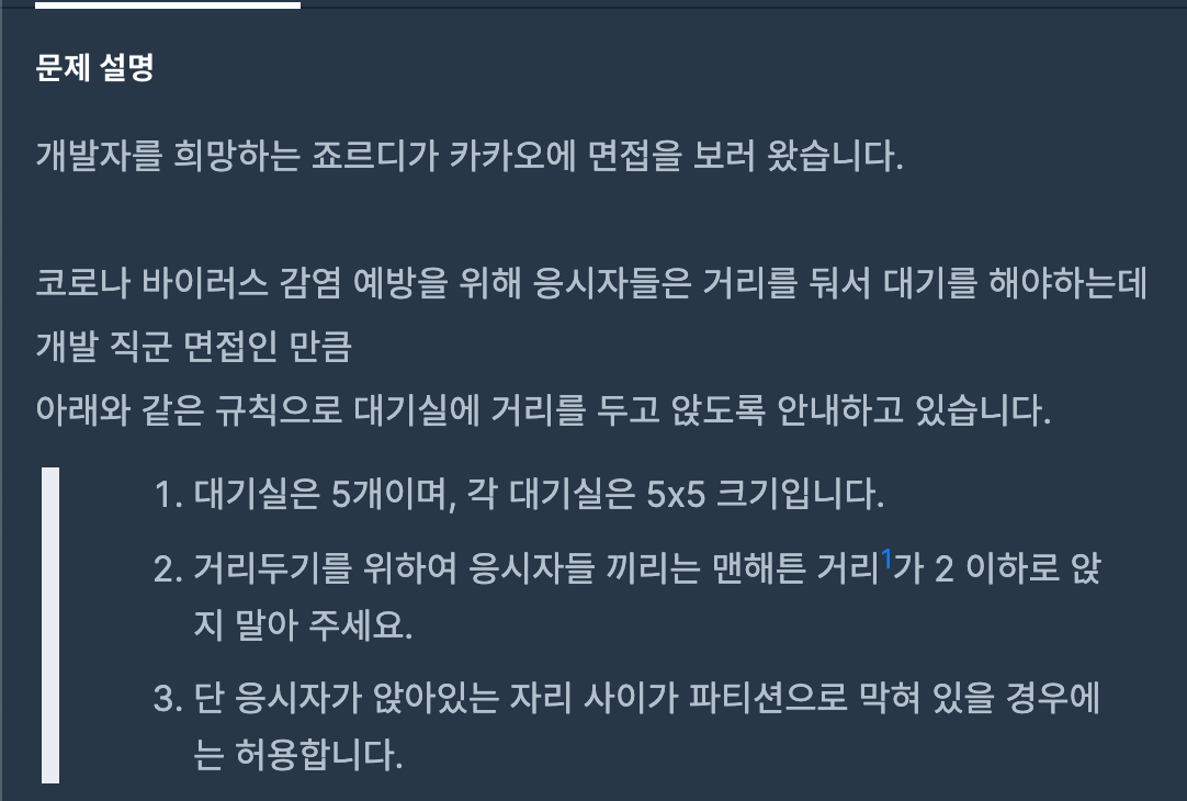 배열요소들을 검사할 때 거리두기가 실패하는 방법만 생각해서 풀었다.
