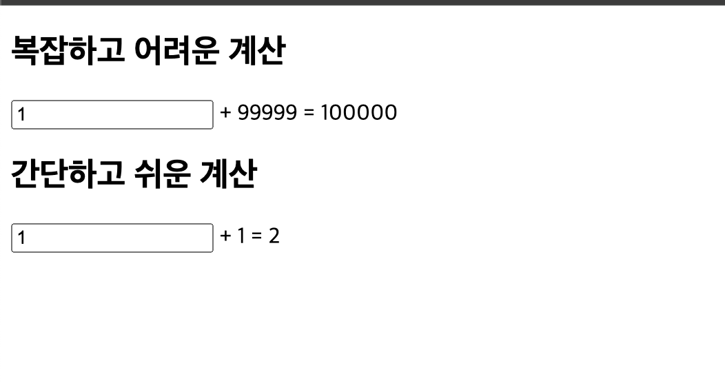 복잡하고 어려운 계산의 값을 변경해도 , 간단하고 쉬운계산의 값을 변경해도 hardCalculate(hardNumber) , easyCalculate(easyNumber)를 가 실행되게 된다. 본래의 의도라면 어려운 계산에서는 hardCalculate가 실행이 되고 쉬운 계산에서는 easyCalculate 만 실행이 됬어야하지만, 컴포넌트의 값을 초기화 하면서 불필요한 함수까지 재실행되는 현상이 발생하게 된다.