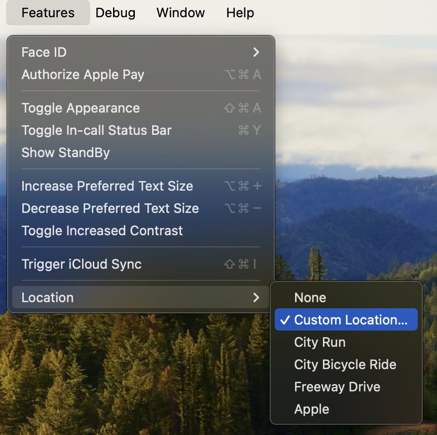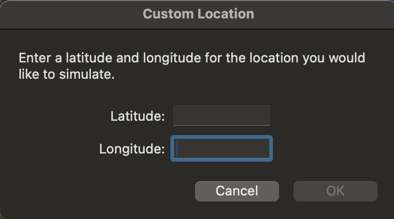 Latitude 와 Longitude 를 설정해주면 이제 Ios Simulator에서는 해당 위치가 gps 값이 된다.